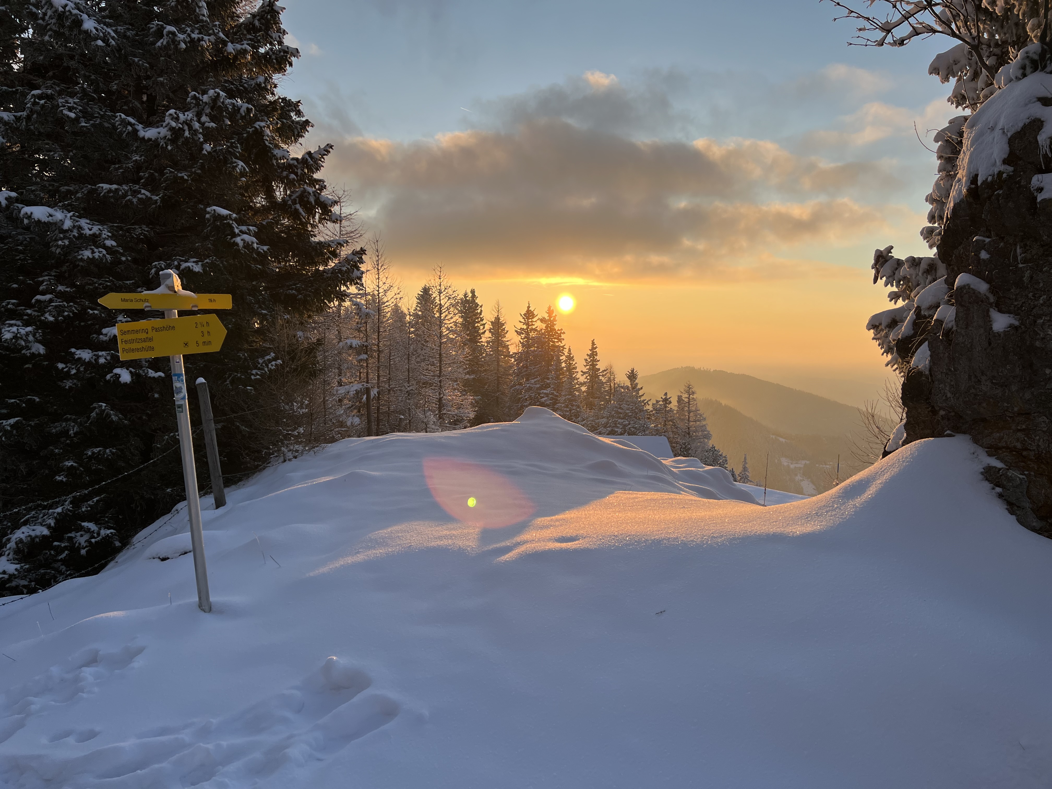 Signs clearly point the way up. The Gebirgsjägersteig leads steadily upwards through the forest. The path is easy to walk, never exposed, but can certainly be described as steep. After just a few meters, a small road crosses the path and after about a third of the ascent you stand for the first time at the edge of the aisle that was cut into the forest for the chairlift that opened in 1955. In 2005 it was officially closed due to non-compliance with fire protection requirements and was dismantled in the years that followed.From here the path meanders upwards along the aisle. The view down is dominated by the mighty valley crossing of the Semmering expressway. After several hairpin bends, you can already see the Pollereshütte when you look up. This was built on the platform on which the Berghotel Pollereshaus, which burned down in 1985, stood.